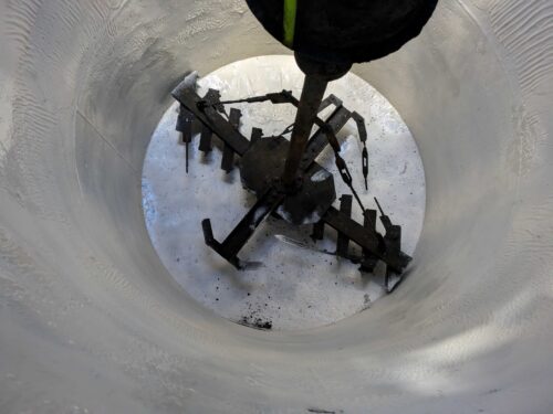 ポリウレア塗装をする前に、沈殿槽内面のエポキシ樹脂を削り取る必要があります。